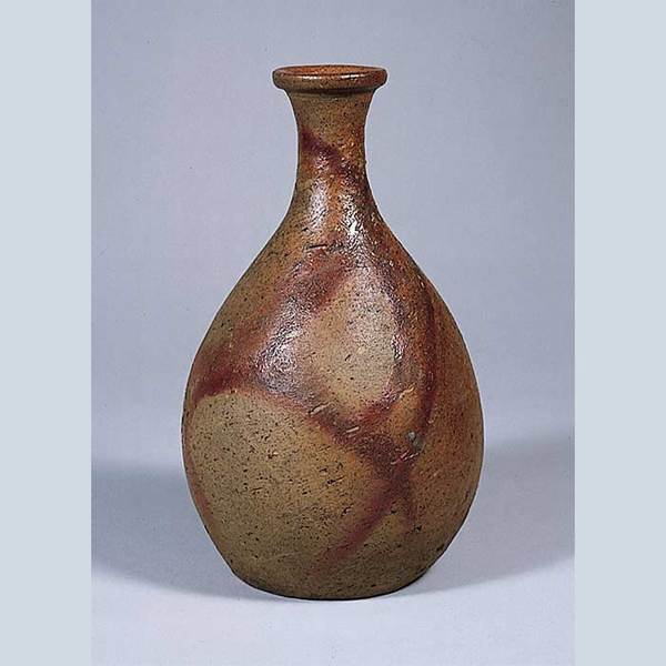 備前火襷徳利/備前焼は、土味を生かした窯変のすばらしさに見るべきものがある。特に火襷と呼ばれる塩分を含んだ藁を器表に巻きつけ、自然に表れる茜色の線条のあるものが珍重されている。この作品は、このような火襷が見事に表れた薤形の徳利で、その安定ある形姿とよく相応し、すばらしい効果をみせている。また、よく使いこなされており、重厚な趣ながら親しみの持てる作品である。