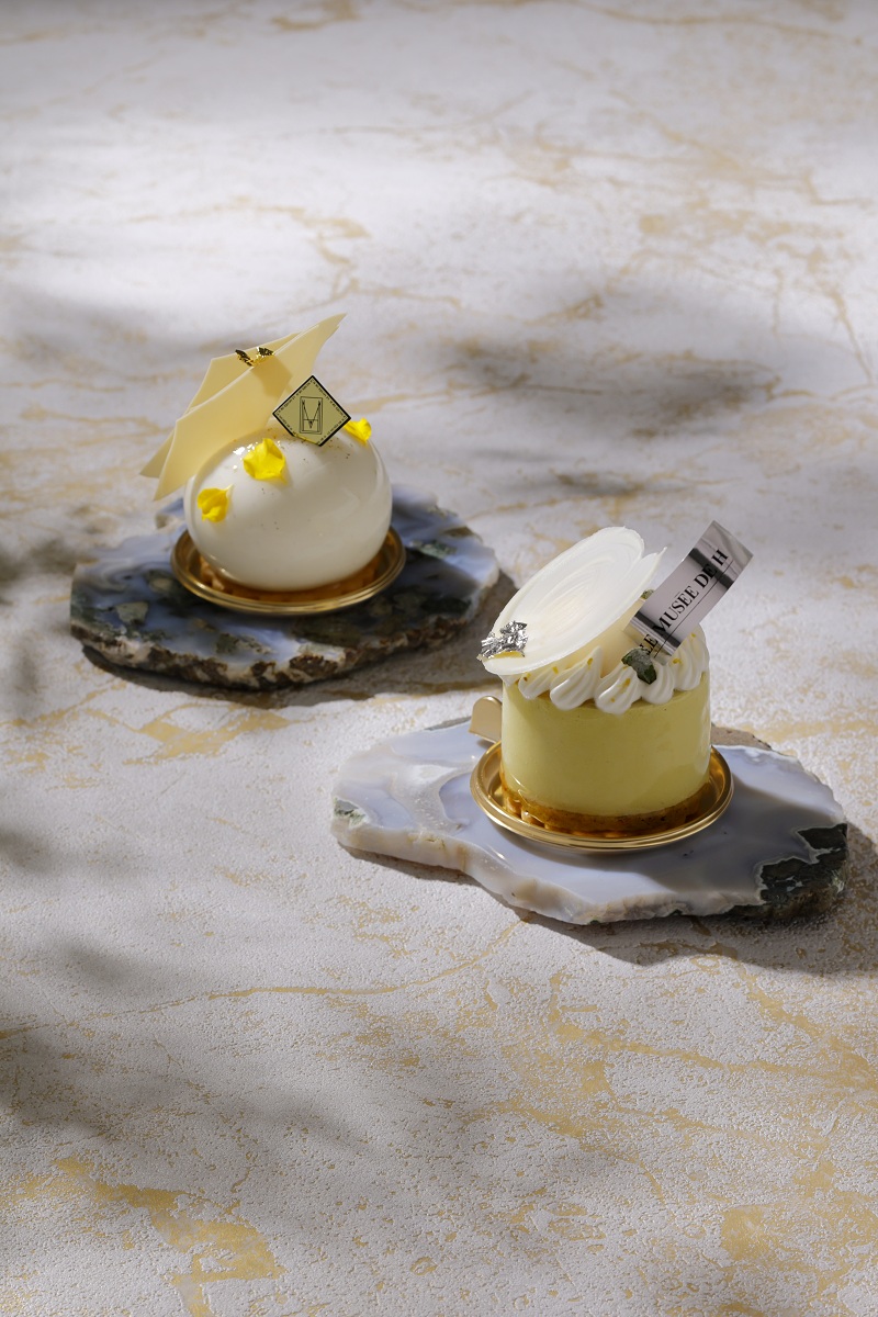 風神雷神図「風神」からのインスピレーション。まろやかなピスタチオムースで全体を包み込み、中心には能登産ミントとグレープフルーツルビーのジュレを閉じ込めました。見た目・香り・味から、“風が吹き抜ける瞬間”を感じていただける一品です。